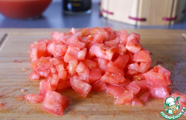 Очищенные от шкурок помидоры нарезать на кубики.