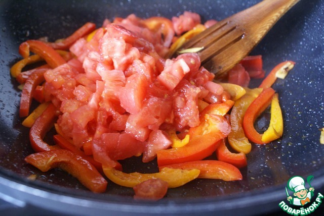 Добавить перцы, обжарить, помешивая, около 5 минут.