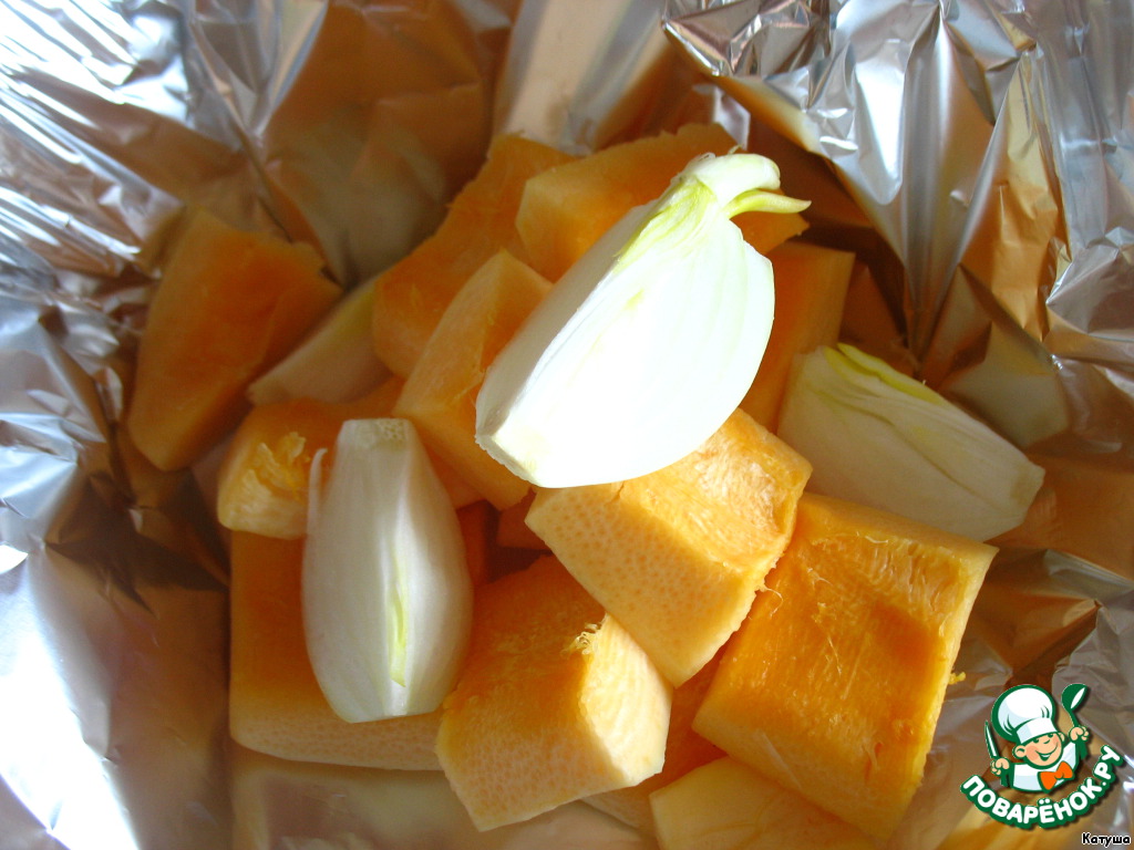 Теперь возьмем 300 г ароматной, яркой тыквы (оказывается, в Америке тыква растёт и как дикое растение), почистим, нарежем, завернём в фольгу вместе с луком и отправим в горячую духовку минут на 40. Овощи нужно непременно печь - они приобретают особый вкус и аромат.