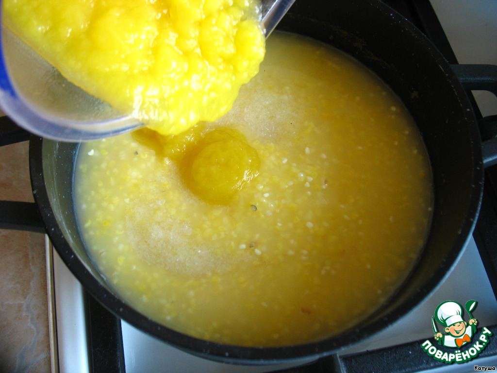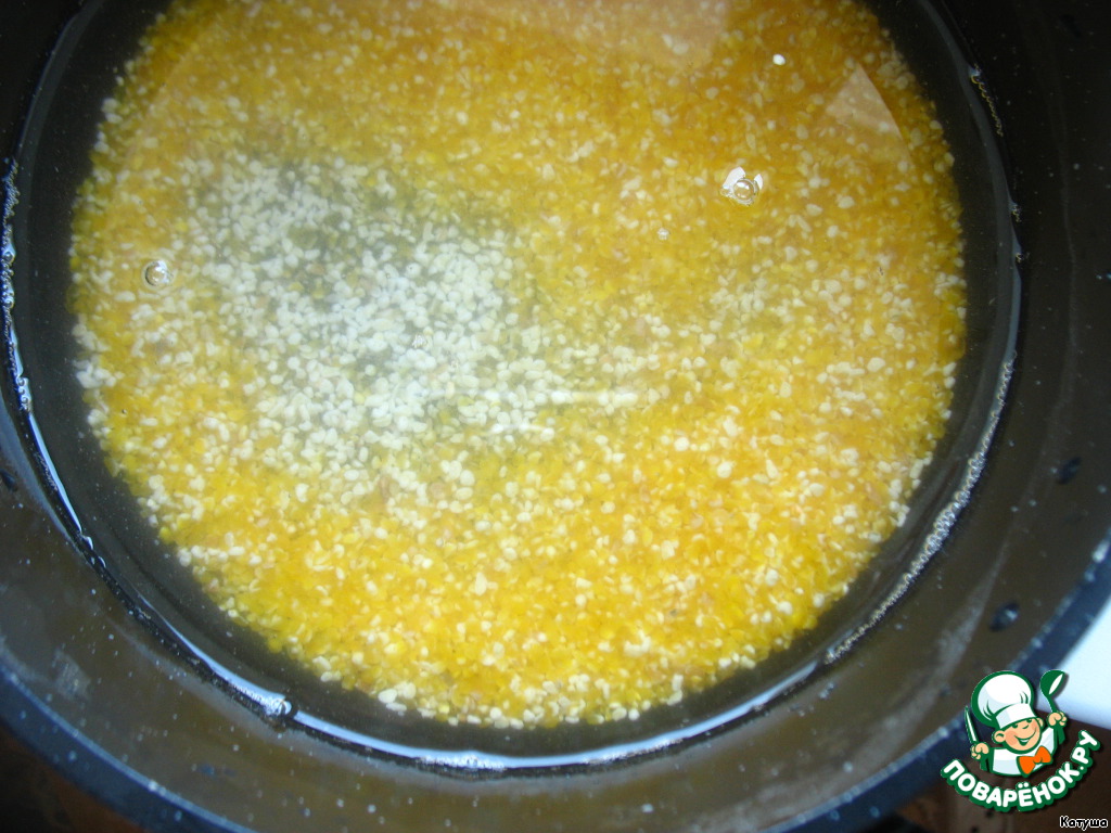 Далее промоем кукурузную крупу, зальём водой и поставим на огонь. После закипания варим минут 30.