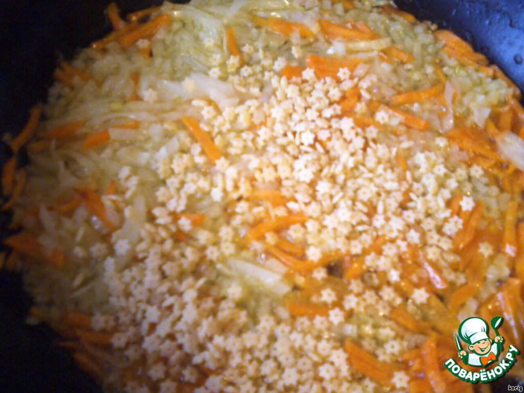 Готовим заправку. Мелко порезать лук, морковь. Обжарить в небольшом количестве растительного масла. Добавляем горсть мелких макарон (НЕ ВЕРМИШЕЛЬ), лучше звездочки. Обжариваем до золотистого цвета, так звездочки не разварятся в супе и впитают вкус моркови с луком.