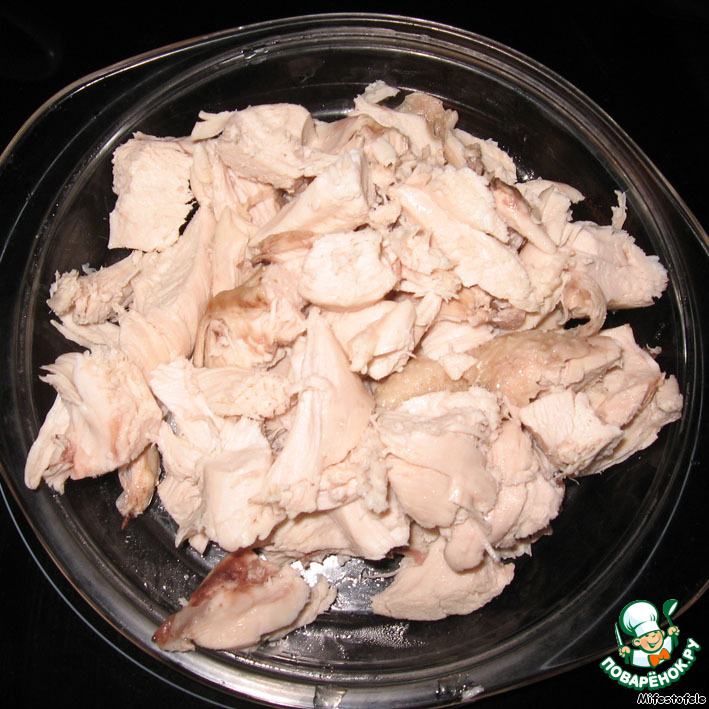 Когда куриное мясо остынет, очищаем его от костей, режем на мелкие кусочки.