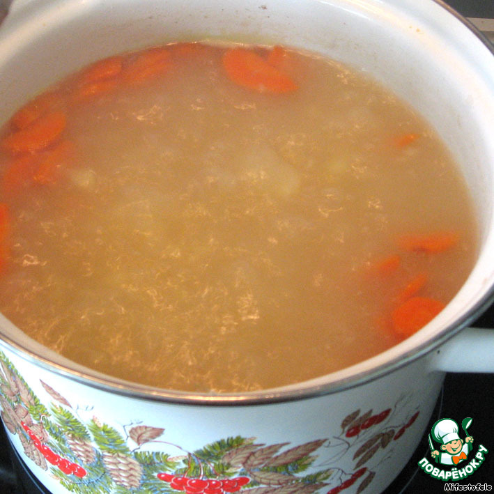 Когда морковь и картофель сварятся (минут 10) также кладем его в кастрюлю.