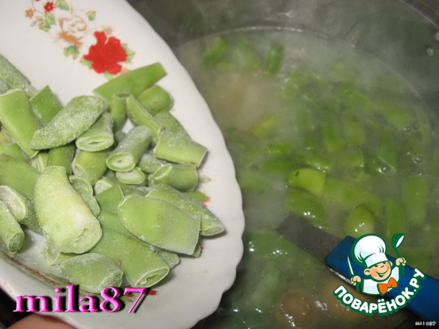 И следом фасоль, после закипания варим минут 5-7. чтобы фасоль почти сварилась.