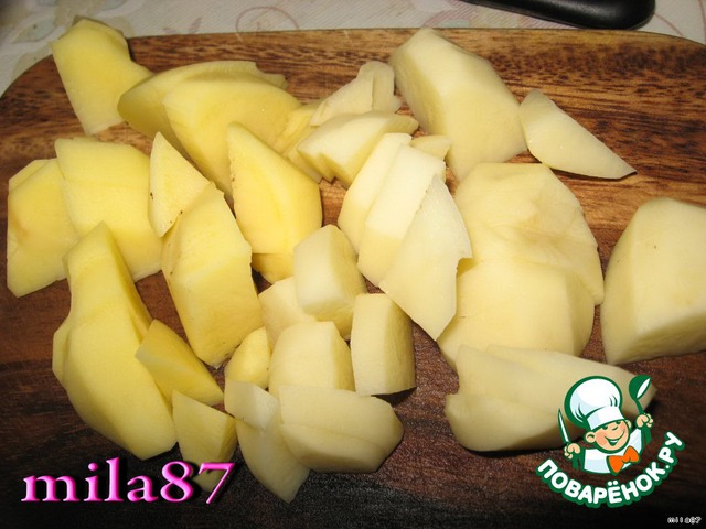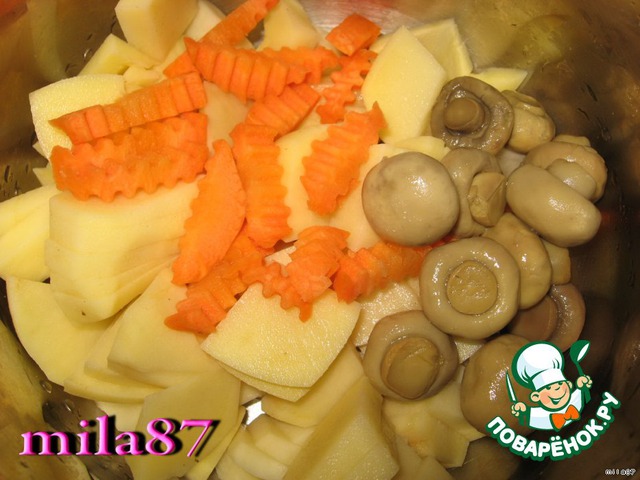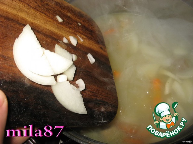 В куриный бульон бросаем картофель, морковь и грибы. Присаливаем и добавляем ваши любимые специи. Варим до готовности картофеля. Затем добавляем лук.