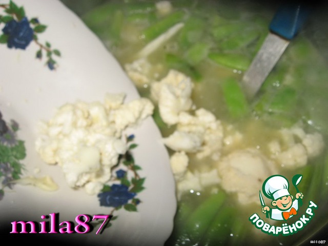 Цветную капусту разбираем на соцветия и бросаем в суп, варим около 5 минут до готовности.