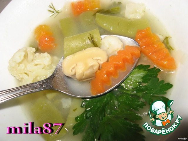| Очень легкий сырно-овощной супчик, очередное спасение для наших объевшихся животиков... у меня почему-то ассоциируется со Снежной королевой... ... сочетание цветной капусты, стручковой фасоли, моркови и картофеля в обрамлении сырного бульона... ммм... Каю бы точно сразу сердце растопило!!!! |
