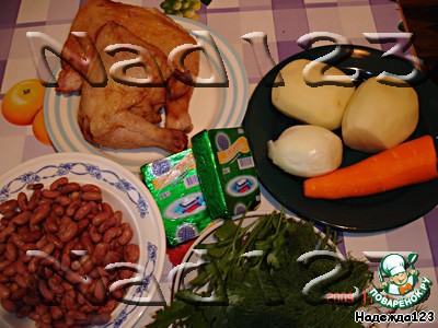 2. В кипящую воду кладем нарезанное куриное мяско, ждем, когда вода снова закипит. Засыпаем уже разбухшую фасоль и варим до полуготовности фасольки, примерно 25-30 минут.