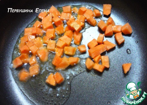 морковь. В маленькой сковороде раскаляем масло и обжариваем морковь. Добавляем лук, еще немного обжариваем, подливаем водички и тушим до мягкости.