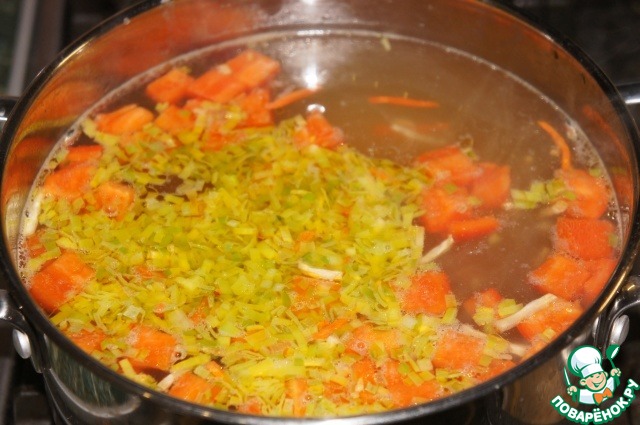 Всыпать порей и пассеровать еще 1 минуту. Отставить.
