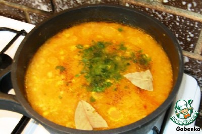 8. Добавьте молотый перец, лавровый лист, измельченную зелень. Варите капустняк еще минут 10, постоянно помешивая. (Внимание! Блюдо может пригореть!) На этом этапе в мясной вариант капустняка Вы можете добавить измельченную тушенку, копченные свиные ребрышки, грудинку и т.д.