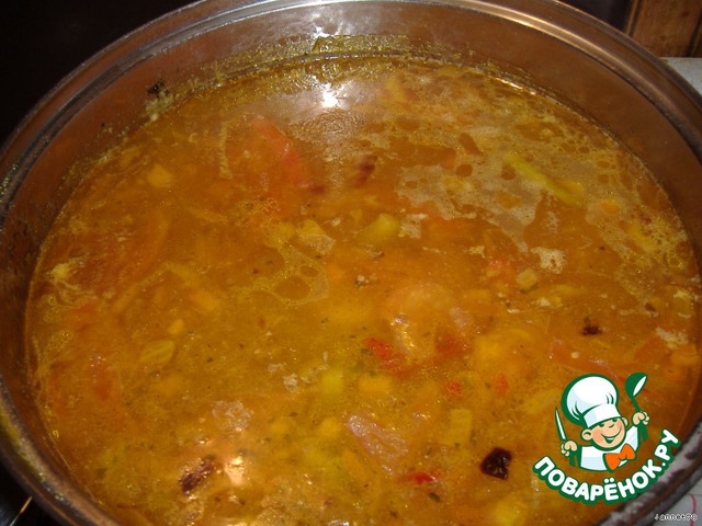 Заправить суп зажаркой, посолить, поперчить, добавить специи (на ваше усмотрение), перед самым концом добавить рубленную зелень.