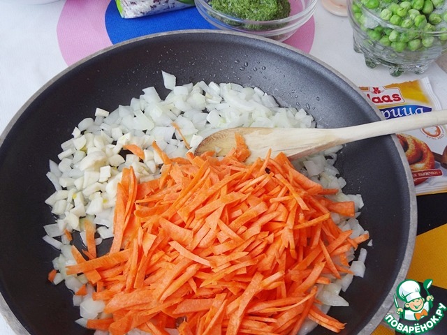 Разогрейте растительное масло в большой сковороде. Пассеруйте лук до прозрачности. Затем добавьте морковь и чеснок.