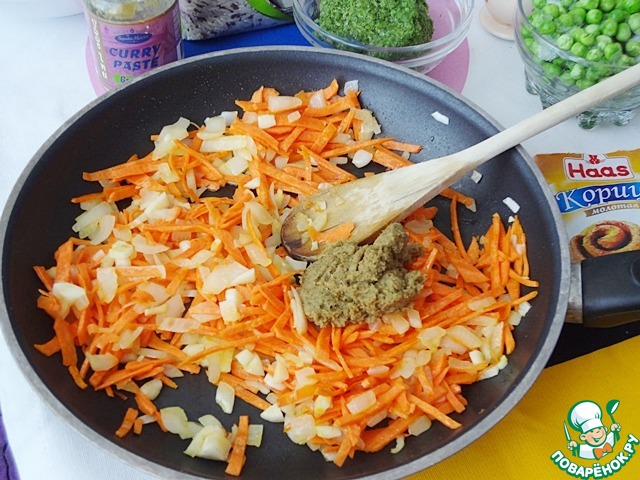 К пассерованным овощам добавьте карри. Можно использовать порошок.