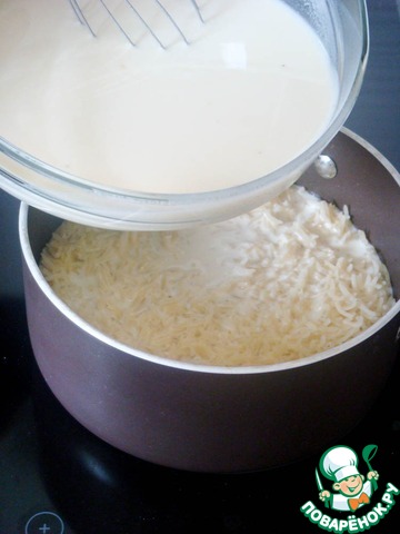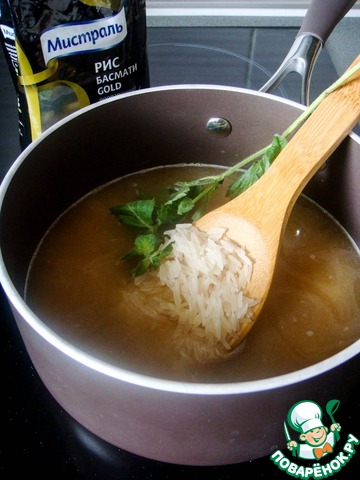 Стакан риса залить тремя стаканами бульона, довести до кипения, накрыть крышкой, уменьшить огонь и варить около 20 минут до готовности риса.