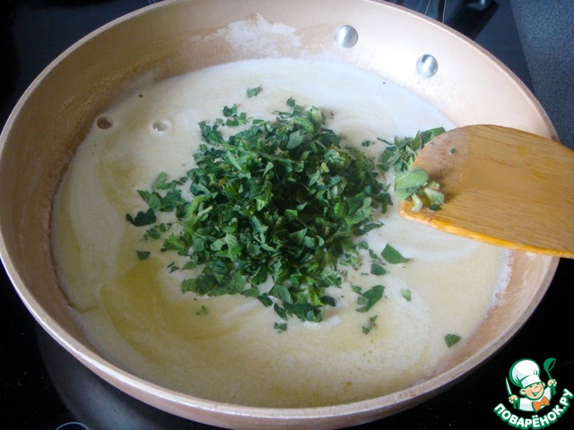 Выключить огонь, добавить мятное масло, выправить на соль и перец, накрыть крышкой и дать немного настояться.