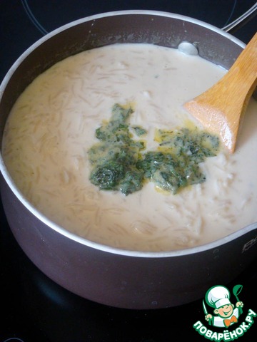 Полученную смесь вылить в кастрюлю с рисом. Поставить на огонь и готовить на медленном огне около 10 минут до того момента пока суп не начнет закипать.