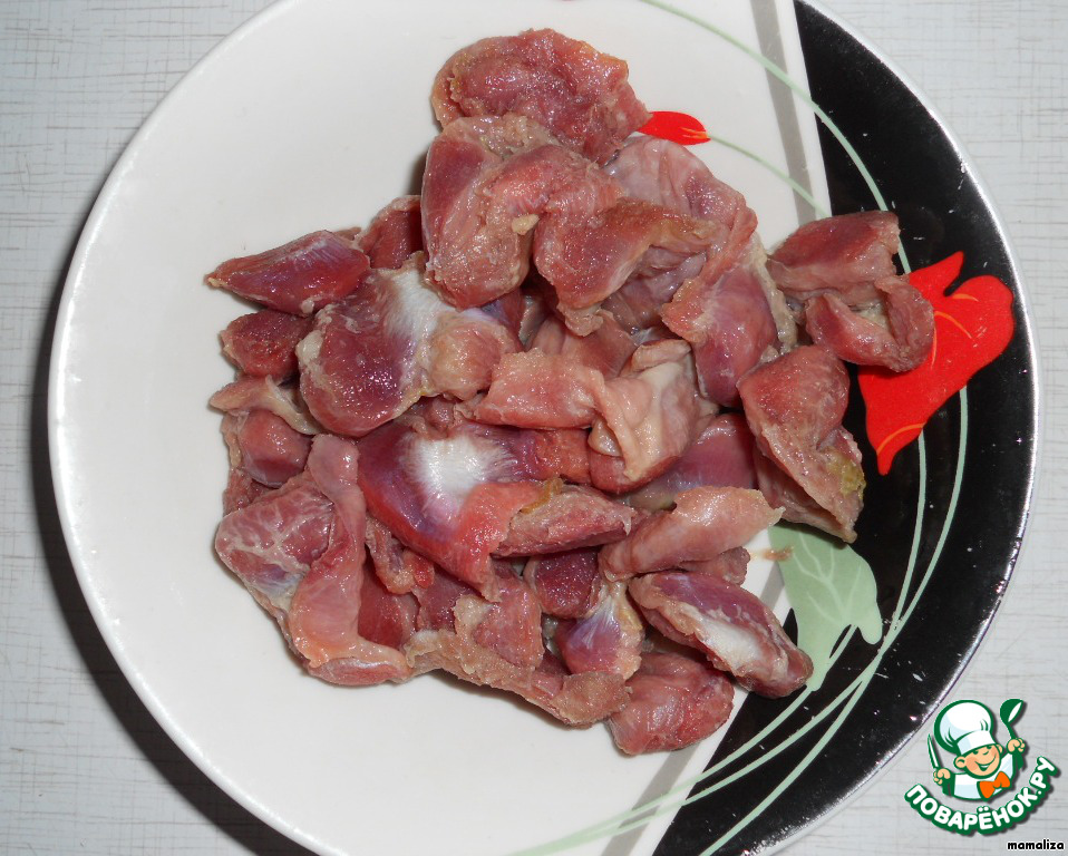 Желудки промываем, чистим, нарезаем и опускаем в кастрюлю. После закипания снимаем пену и томим все на маленьком огне минут 40.