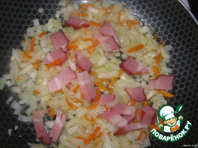 Нарезаем лук, обжариваем его на растительном масле вместе с морковью.