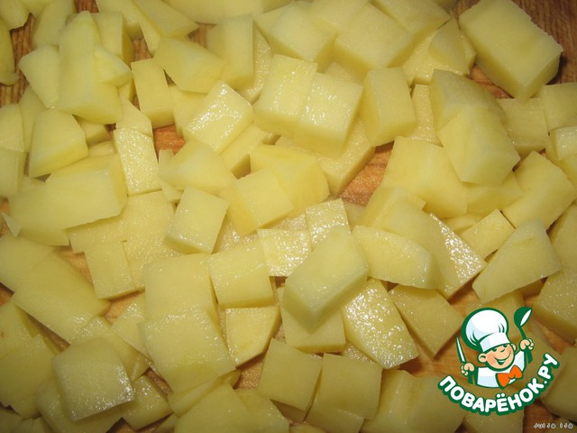 Когда горох будет почти готов, добавляем нарезанный картофель. Доводим всё до готовности.