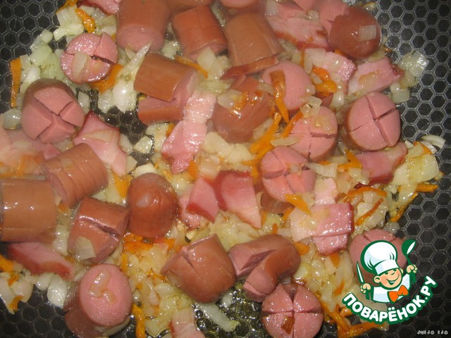 Обжаренные овощи с сосисками. Варим минуты 3.