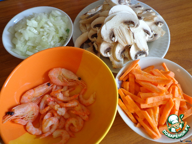 Лук мелко режем. Грибы режем пластинками, если вам удалось купить маленькие, то можно на 2 или 4 части. Морковь нарезаем соломкой. Креветки отвариваем буквально минуту и очищаем (можно купить уже очищенные отварные - это не принципиально, но мы же не ищем лёгких путей )))