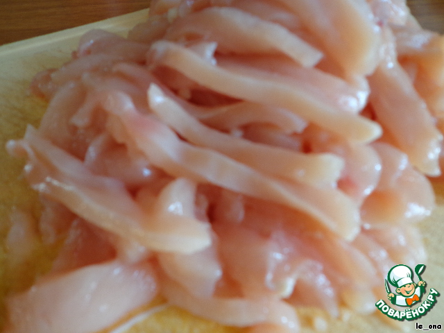 Курицу режем полосками.