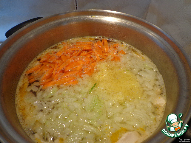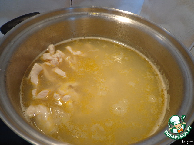 В кипящий бульон сначала курицу, поварить минут 5, пока не закипит.
