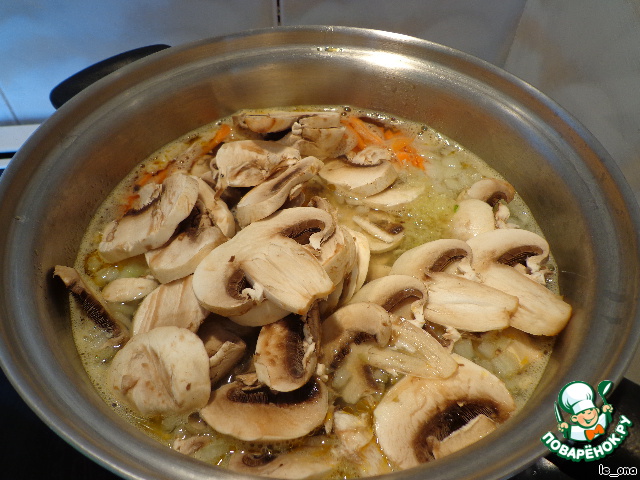 Шампиньоны и варим на маленьком огне под крышкой минут 15.