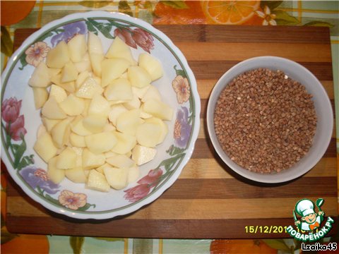 Очищенную картошку нарезаем кубиками. Гречку тщательно промываем. Всё добавляем в суп и варим до готовности.