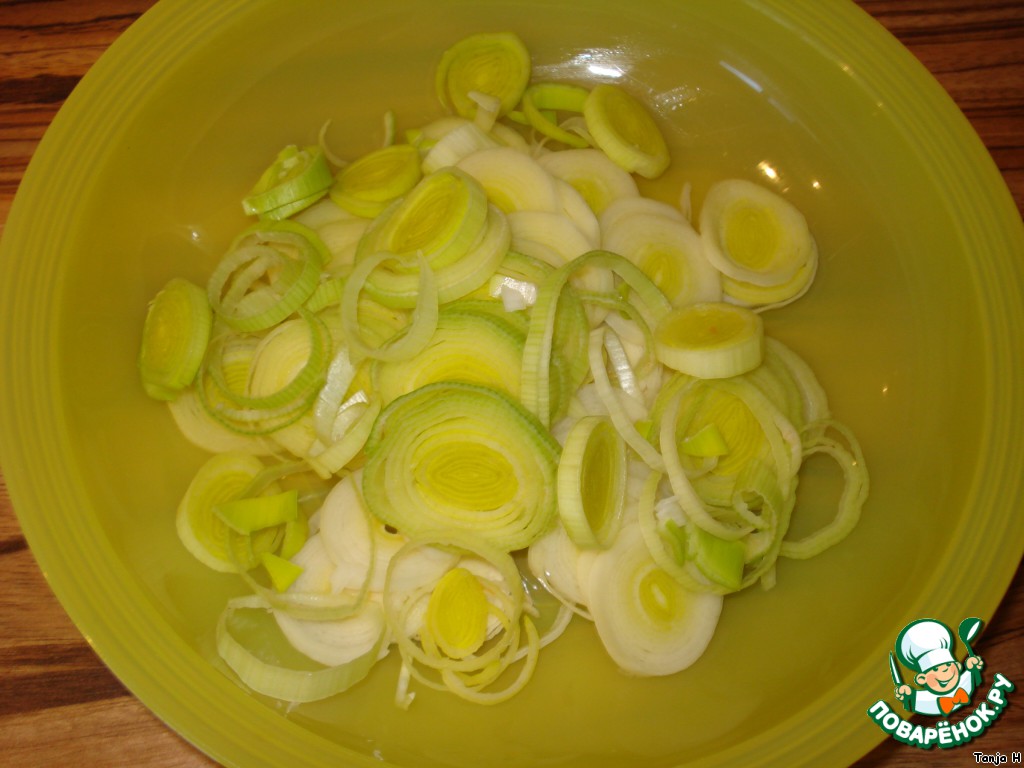 Лук-порей порезать кольцами тонко.