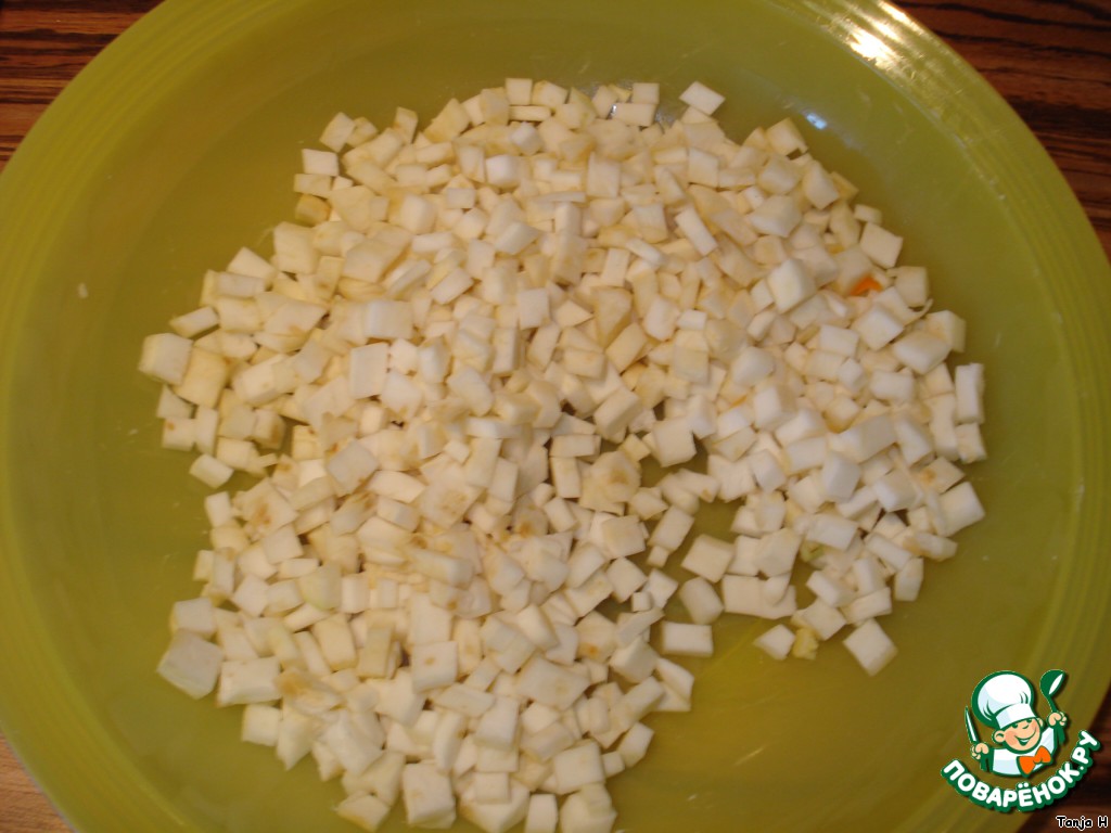 Корень сельдерея мелко порубить, можно при желании нашинковать на терке.
