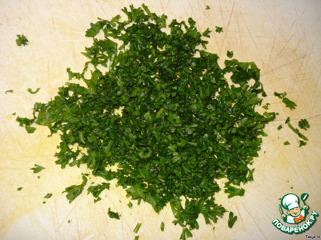 Зелень мелко порубить.