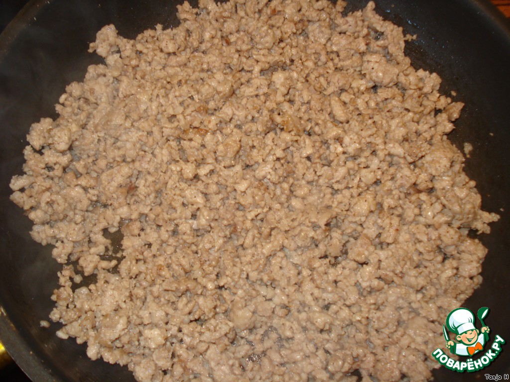 Фарш солим, перчим, обжариваем на масле до готовности, не зажариваем.