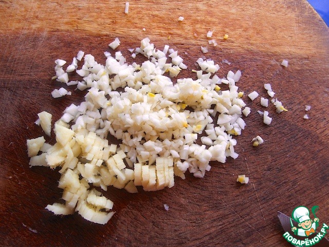 Мелко нарезать чеснок, имбирь.