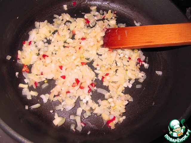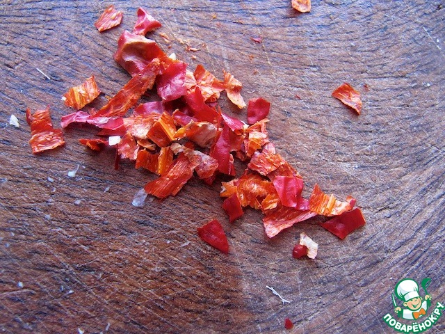 Мелко нарезать перец чили. У меня сушеный, использую без семян, чтобы не было очень остро!