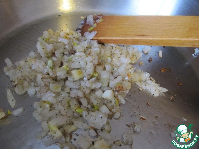 Тем временем на разогретой со сливочным или растительным маслом сковороде обжариваем мелко нарезанный лук до мягкости.