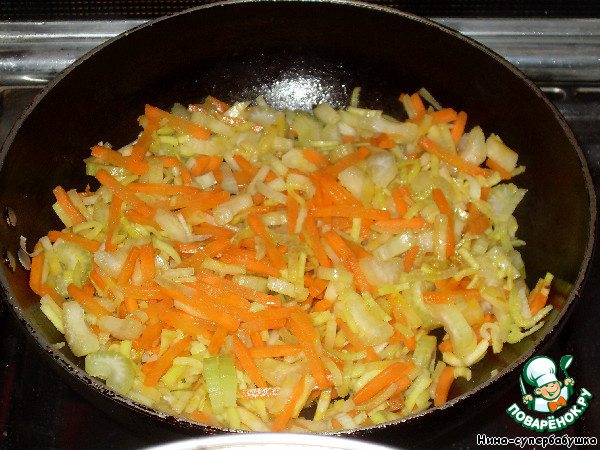 затем добавить порей и черешковый сельдерей, тушить минуты 3,
