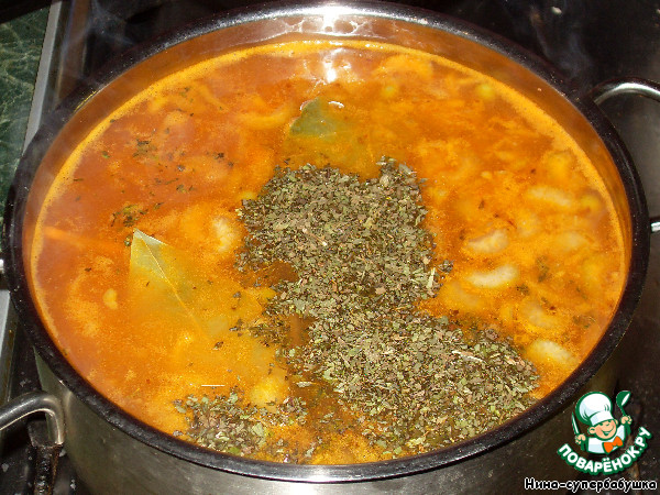 Добавить пару лаврушек и варить на слабом огне до готовности овощей. Чеснок измельчить, добавить в суп, выключить огонь, накрыть крышкой и настаивать 10-15 минут.