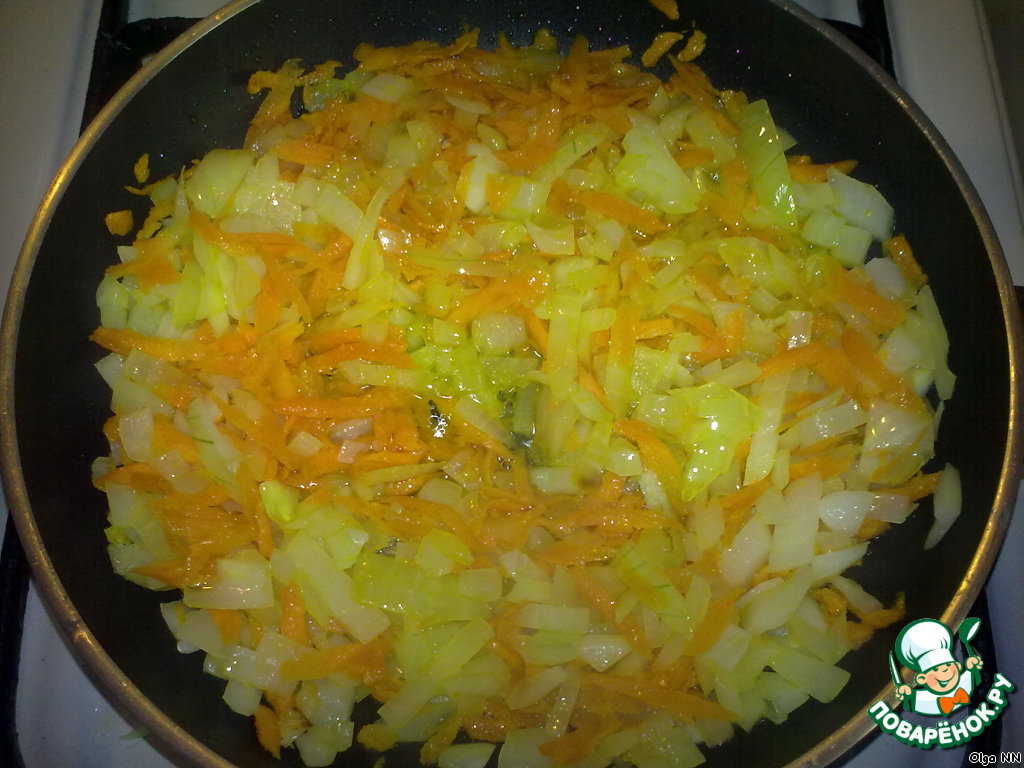 Лук мелко порезать, морковь потереть на крупной терке. Пассеровать на сливочном масле.