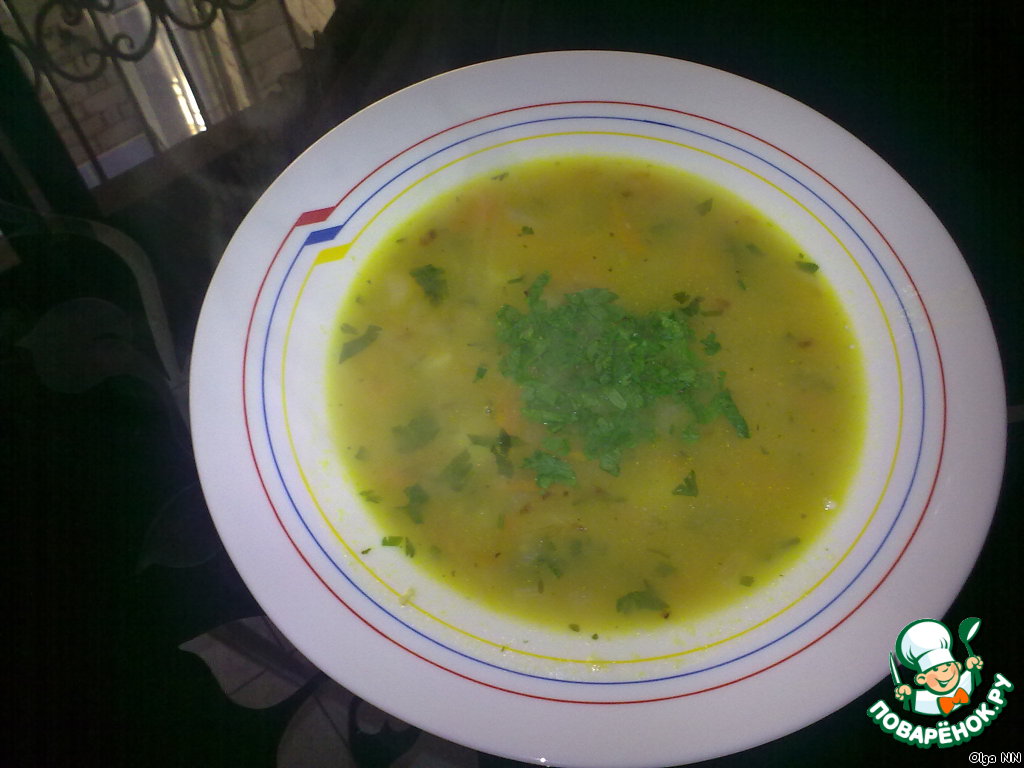 В готовый суп добавить мелко порезанную зелень петрушки и/или укропа. ГОТОВО!