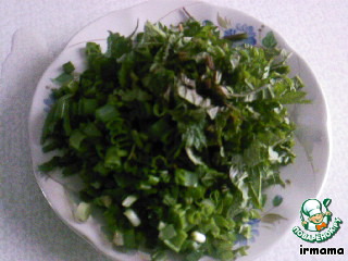 Крапиву, зеленый лук и зелень чеснока нарезать