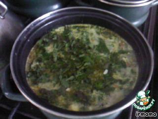 Тонкой струйкой влить яйцо в суп. Добавить зелень, дать закипеть на минутку.