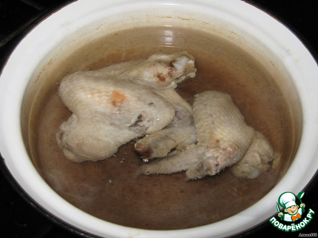 Кладем в кастрюлю, заливаем водой и ставим на огонь куриные крылышки, солим, добавляем лавровый листочек, черный перец горошком.