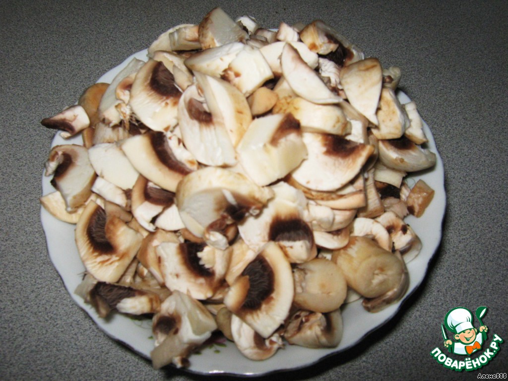 Выкладываем грибы на сковородку с небольшим количеством подсолнечного масла, сразу солим, перемешиваем, закрываем крышкой и на небольшом огне выпускаем из грибов жидкость, затем открываем крышку, сливаем жидкость и даем грибам немного обжариться.