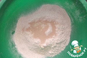 В просеянную муку добавляем сахар, соль, дрожжи.