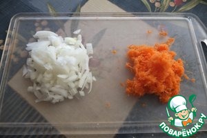 Луковицу нарезаем кубиками, морковку трём на мелкой тёрке.