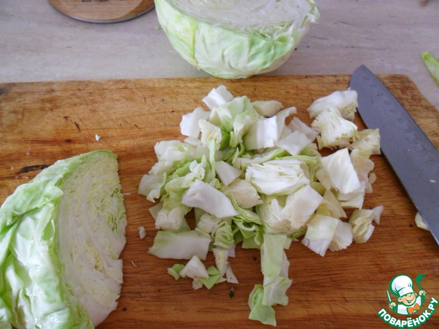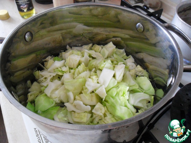 Выложить ее в кастрюлю и залить небольшим количеством воды. Варить на слабом огне минут 10-15. Если капустка молодая, то не надо варить ее так долго - можно сразу же положить к ней остальные овощи.