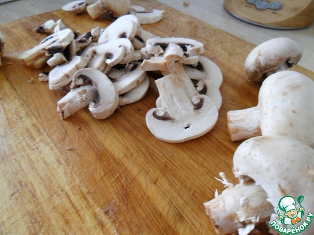 Грибочки промыть и дать стечь влаге. Нарезать их небольшими ломтиками.
