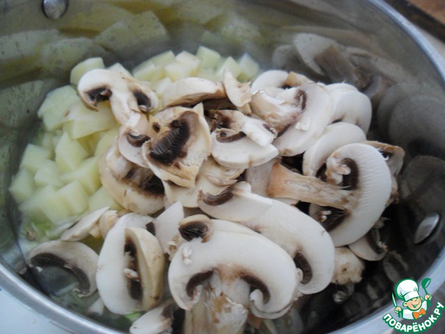 Грибы и картофель переложить в кастрюлю к капусте. Продолжать варить на слабом огне еще 10-15 минут.